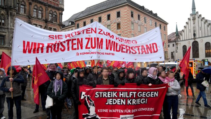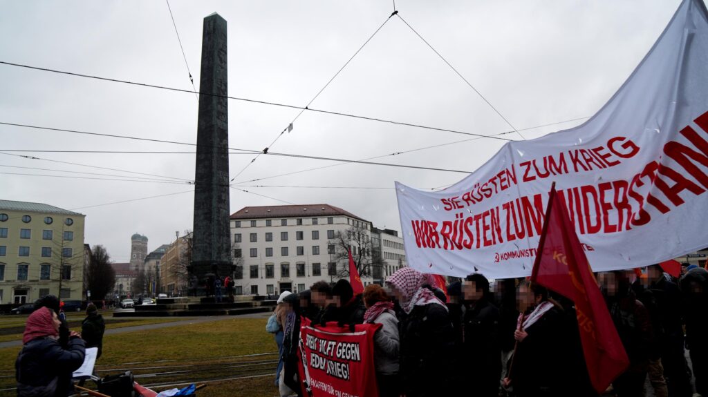 Begleitet wurde der Demozug von hochgerüsteten Polizei-Spezialeinheiten und Hubschrauber kreisten über uns. Teile der Demo wurden von der Polizei angegriffen. In diesem Jahr waren wir das erste Mal als organisierter Block der Kommunistischen Partei bei den Protesten gegen die Münchner Kriegskonferenz. Wir haben gezeigt: Ja, wir sind bereit zu kämpfen. Aber nicht für ein System, das keine Zukunft für uns hat. Wir kämpfen für eine Welt ohne Kriege. Für eine Welt ohne Ausbeutung und Unterdrückung. Für den Sozialismus-Kommunismus.